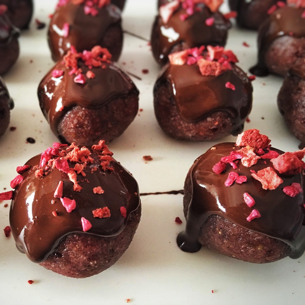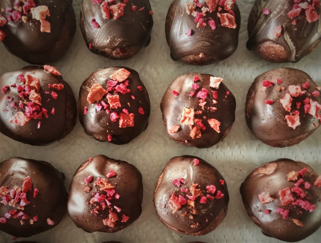 - Remove the balls from the fridge and spoon the melted chocolate over them (you can sprinkle toppings on as well if you like, I add a pinch of freeze dried raspberry pieces or some desiccated coconut).